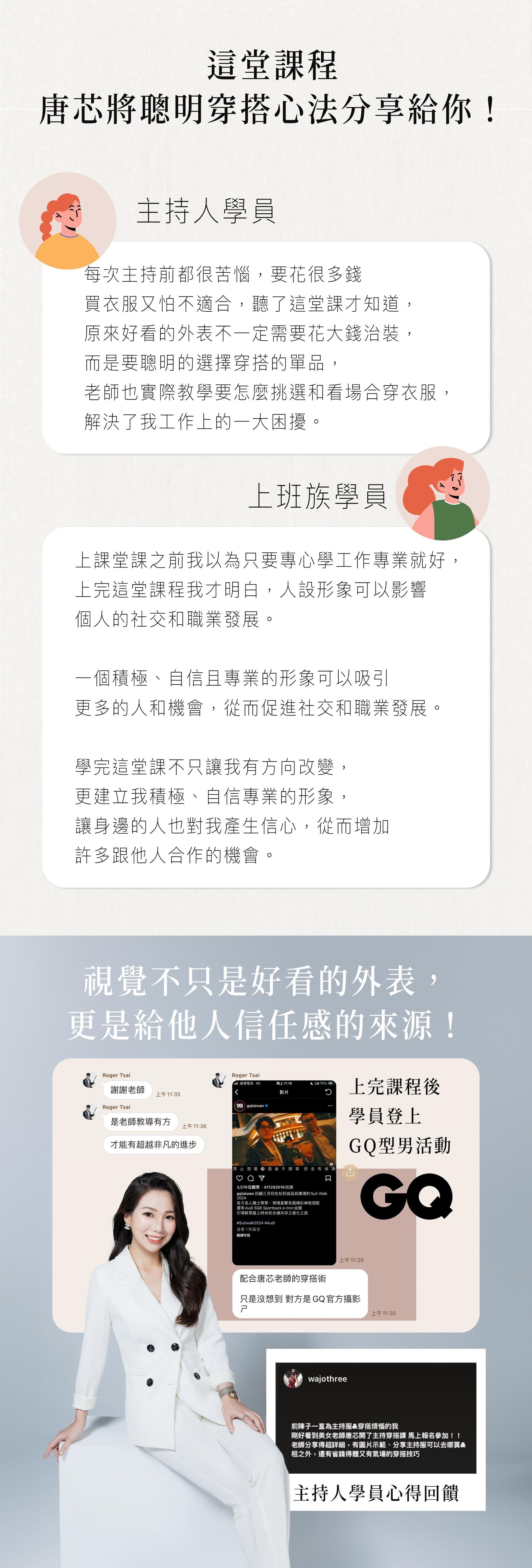 A:非常需要,在經營自媒體的人必買,『第一印象』視覺才能符合受眾的心理期待,透過課程『3S穿搭關鍵字』分析三種高級人設給您!