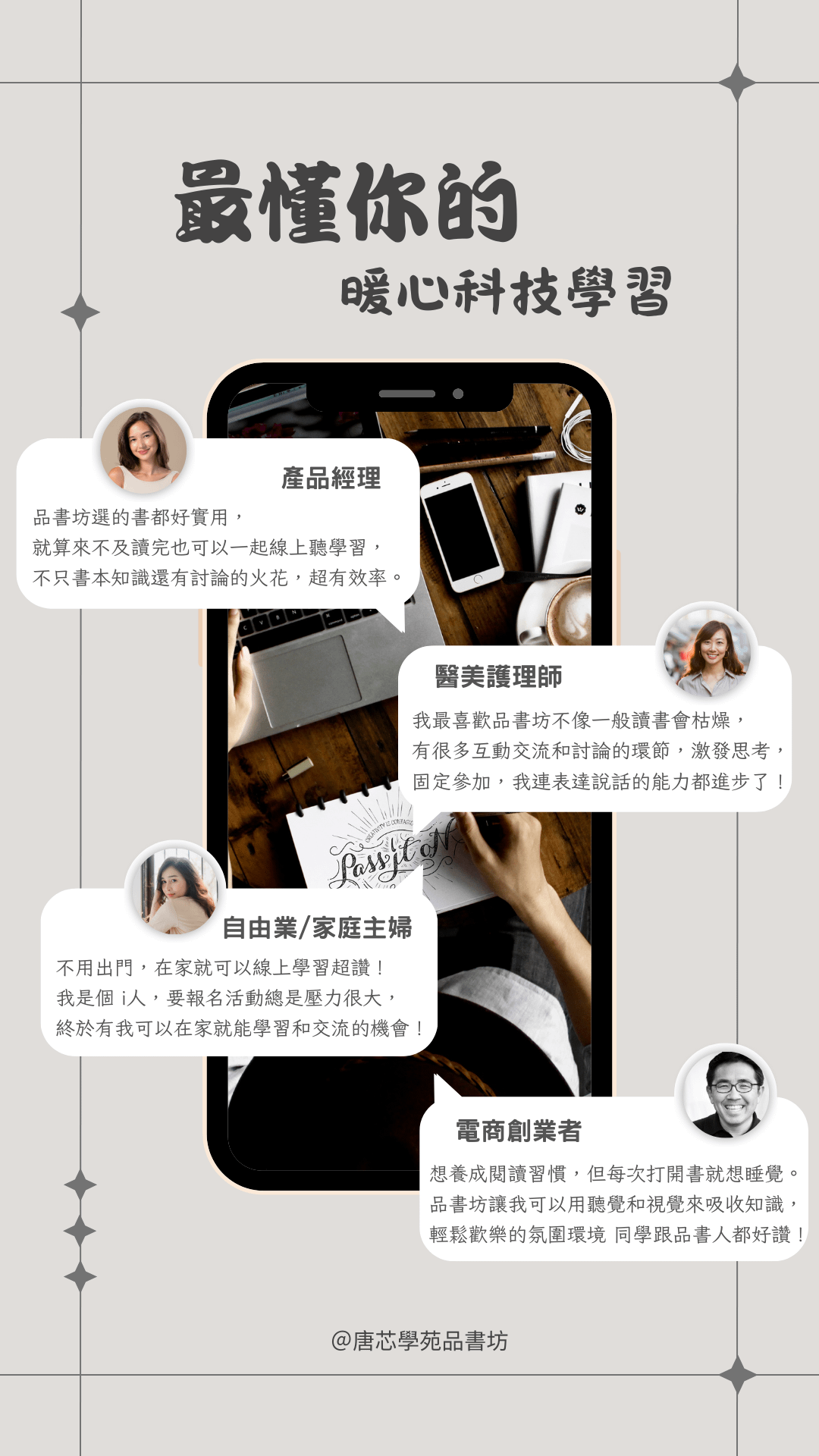 一起在家優雅品書,提供給您最好的學習環境,讓品書人帶著你暢遊書中精華。